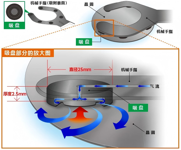 陶瓷机械手臂采用伯努利原理:供给口导入的气体会从吸盘的内部圆筒状侧面的喷口高速喷出,并在吸盘内部的筒状空间内形成旋转气流,并形成负压。气流最终通过机械手指吸附表面和晶圆表面之间的间隙释放到外部空间。气流在旋风吸盘和晶圆之间的空间中形成稳定的层流,并造成晶圆上下表面间的压力差,最终形成对晶圆向上的吸附力。