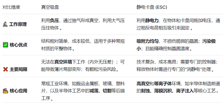 真空吸盘和静电卡盘的核心区别在于工作原理和适用环境。