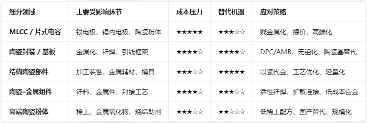 国产替代加速:海外高端陶瓷(MLCC、陶瓷封装)因成本上涨提价,为国内厂商切入中高端市场创造窗口期。